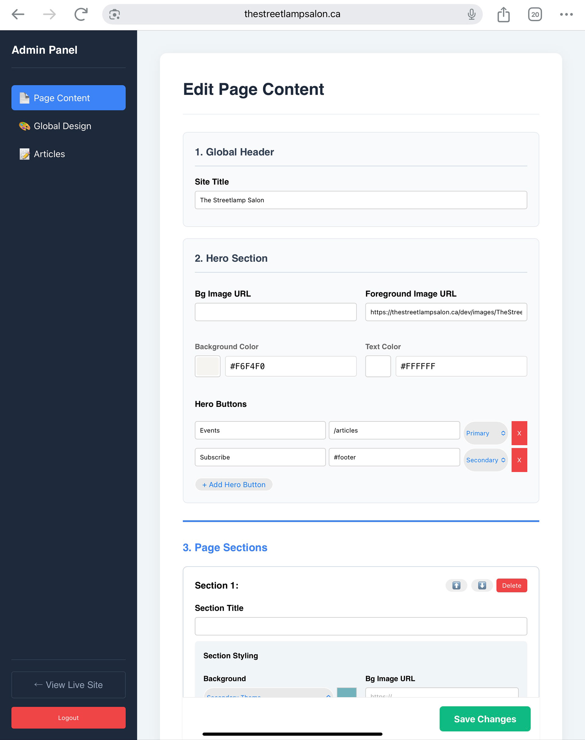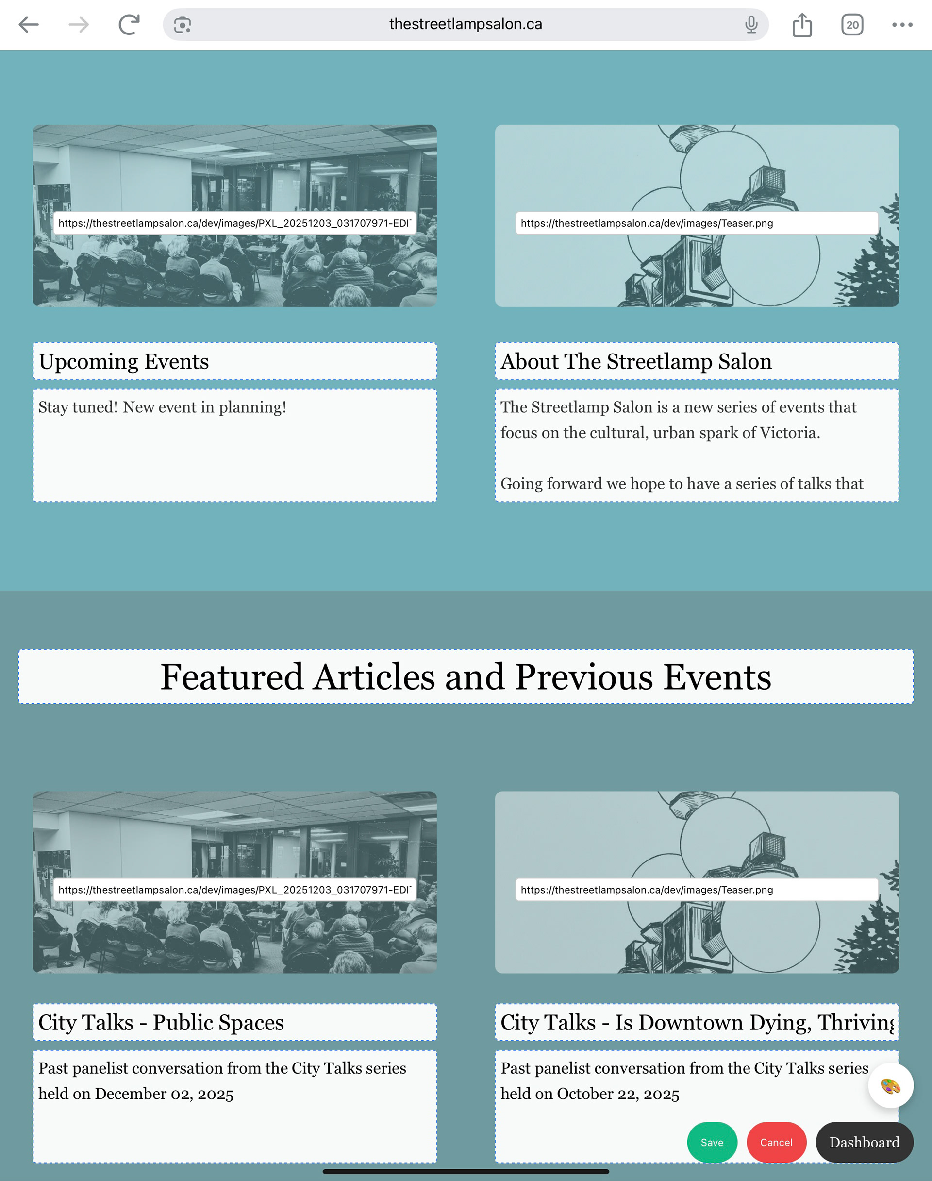 The Streetlamp Salon is a series of events that focus on the cultural, urban spark of Victoria. Created using React.js as an app to allow editors to quickly add and edit content on the live site directly, with a more robust backend for site structure and content.